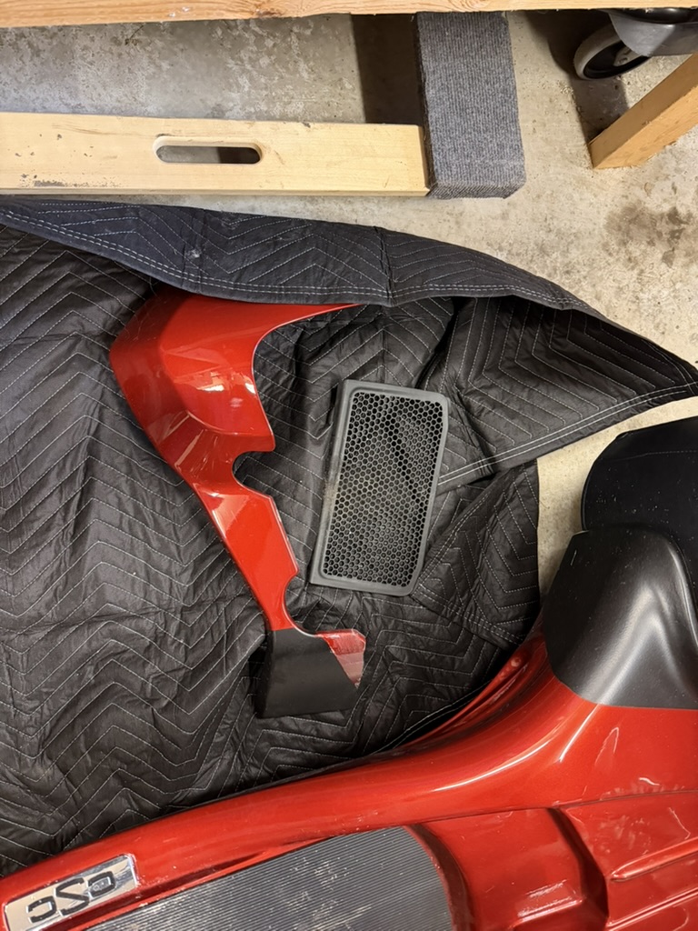 The paint on these things is worth hundreds of dollars, and my trike kit has ‘trapped’ the lowest part of the painted bits behind its aerodynamic floorboards. The painted lowers are held on entirely with friction-fitted rubber grommets into which plastic pegs from the painted bit are inserted. Basically, it is a tug of war with the lower’s grommets and the compression applied by the aero kit, with fear about breaking the lowers or gouging the paint worse than it already being my constant companion.